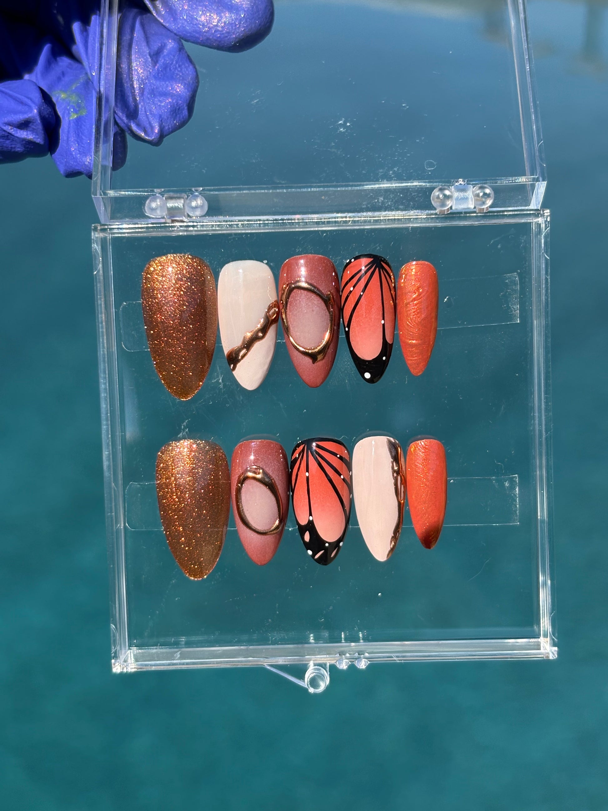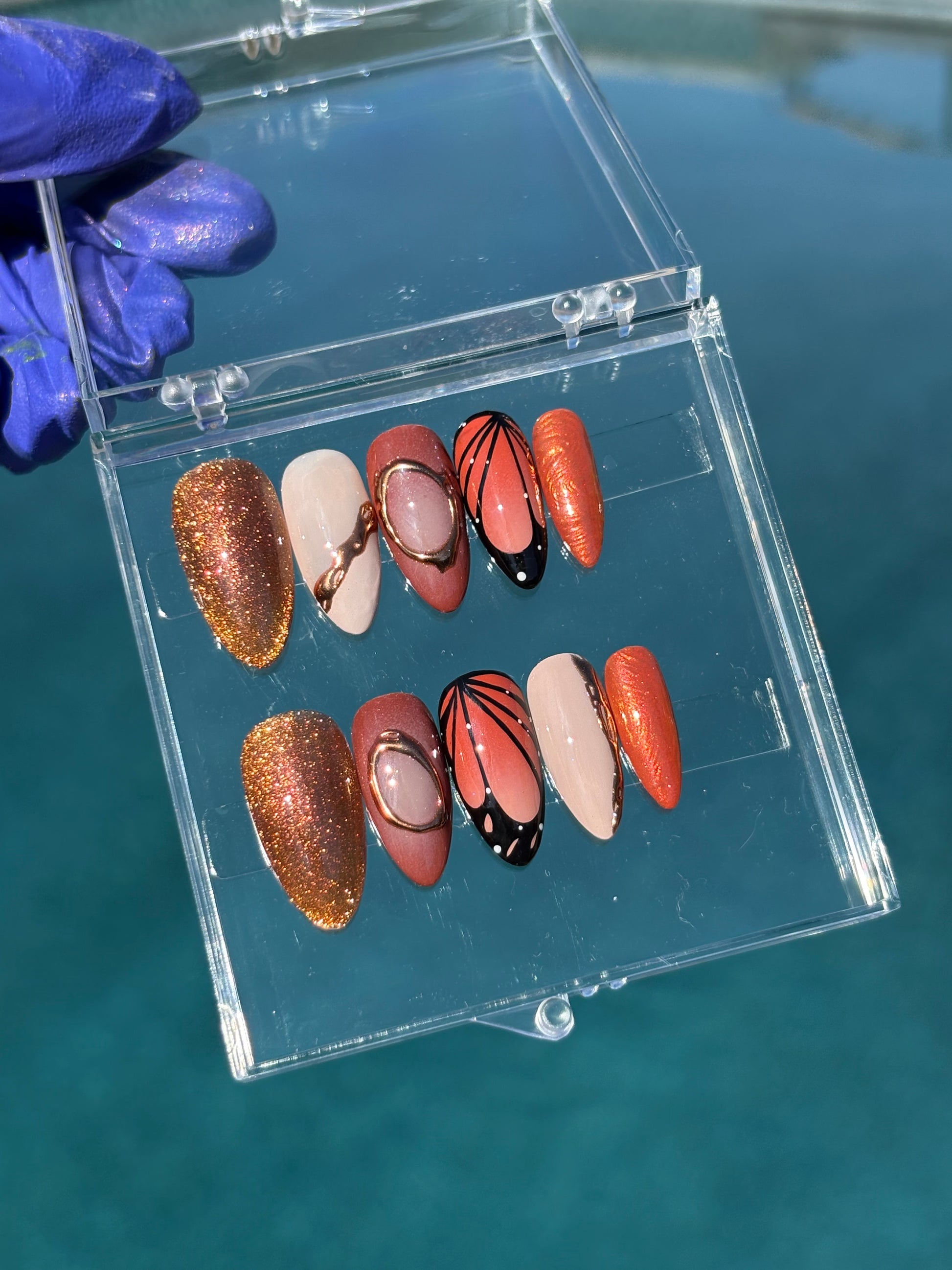 Each set comes with 10 handmade press on nails, and each order comes with a prep bag including Nail Glue, Sticky Tabs, Buffer, File, Cuticle Pusher and Alcohol Pad.