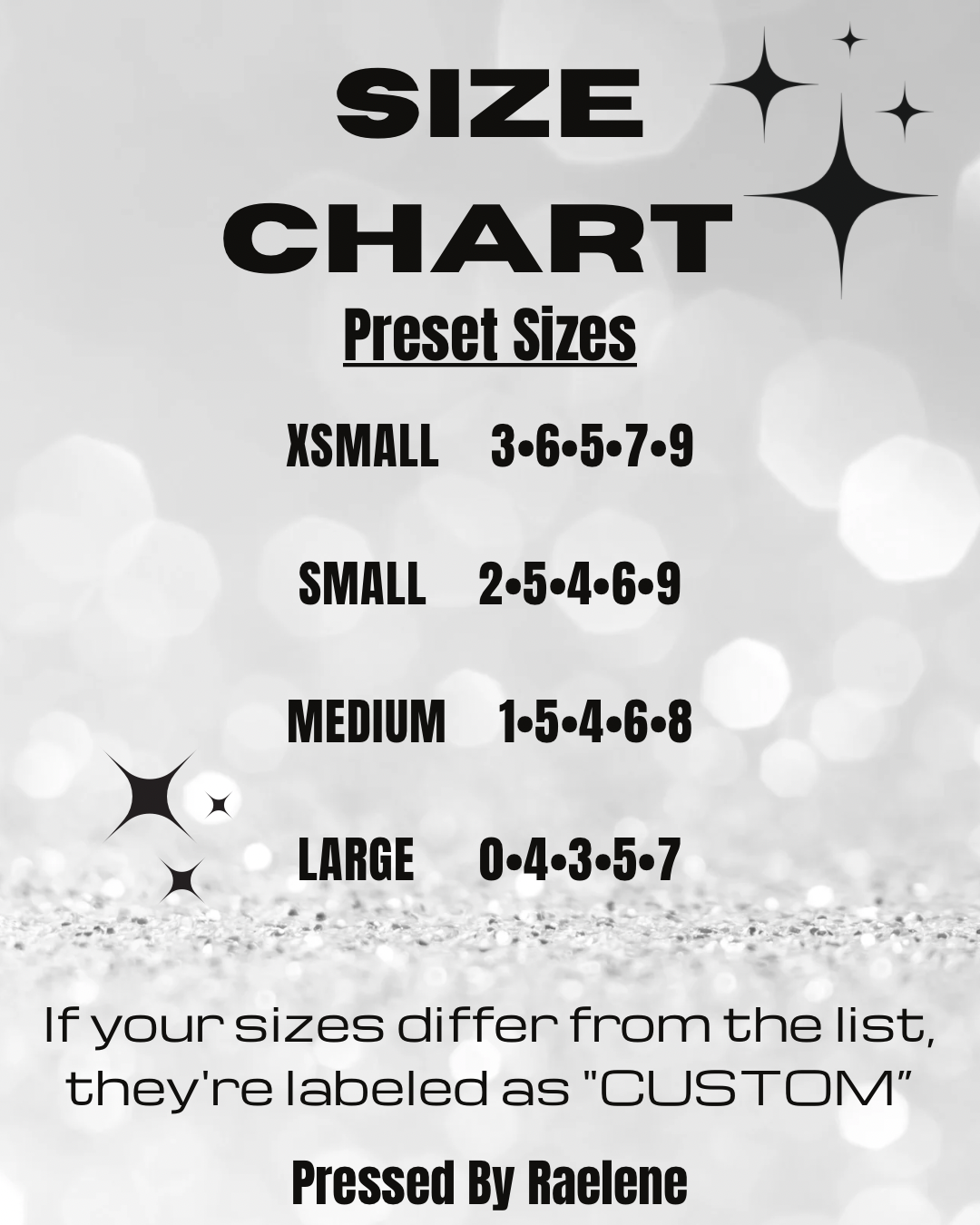 If you don’t fit the sizes listed in the chart select the custom option for the size and select personalization and enter your sizes in tip # or mm. IF YOU DO NOT SEND A NOTE STATING YOUR SIZES, BE AWARE THIS WILL CAUSE A DELAY IN YOUR ORDER, AS I WILL BE UNABLE TO PROCESS YOUR ORDER WITHOUT YOUR SIZES.
