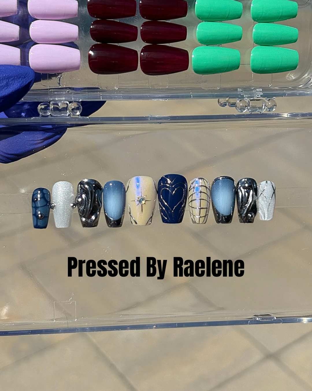 Each set comes with 10 handmade press on nails, and each order comes with a prep bag including Nail Glue, Sticky Tabs, Buffer, File, Cuticle Pusher and Alcohol Pad.