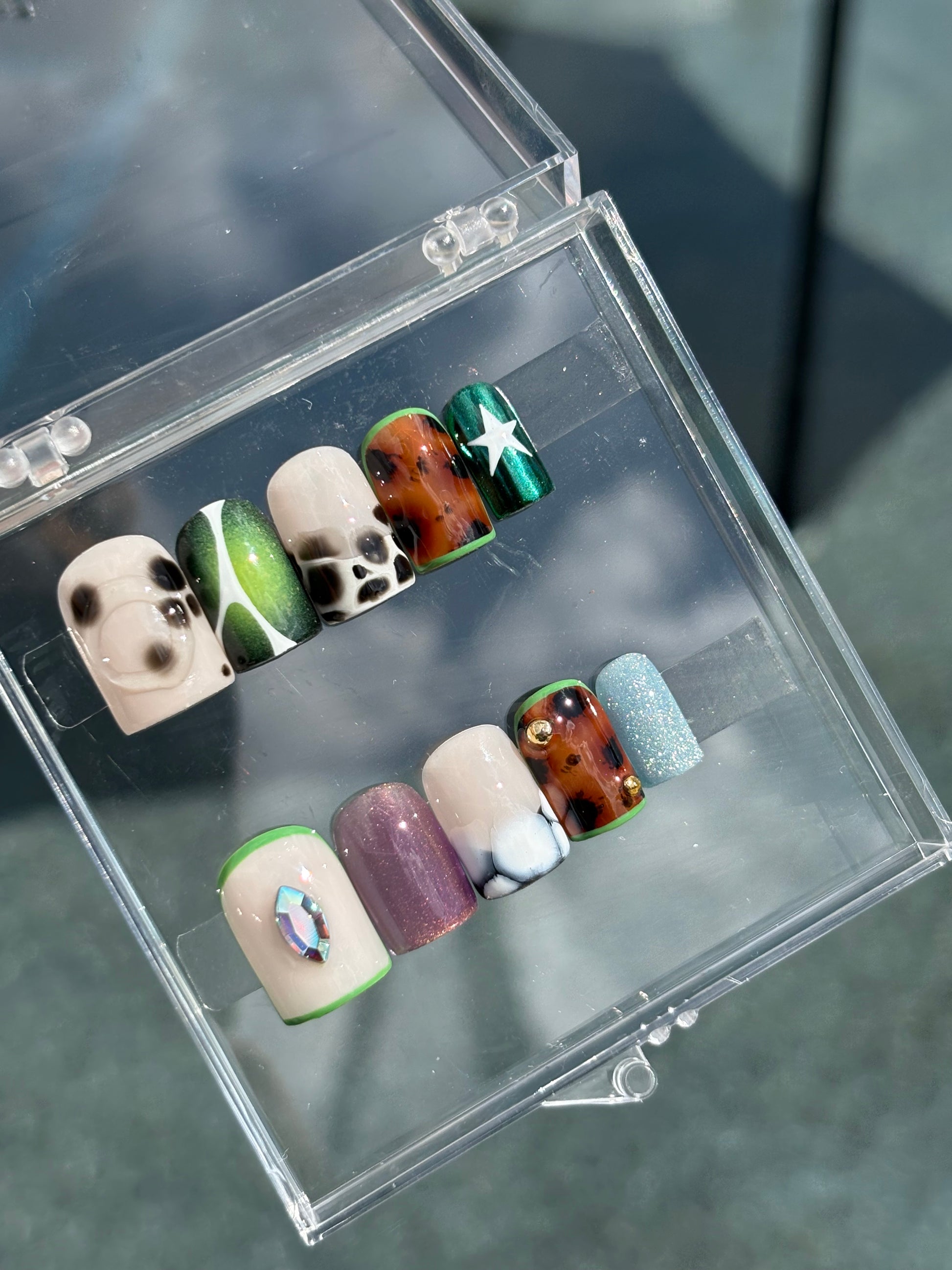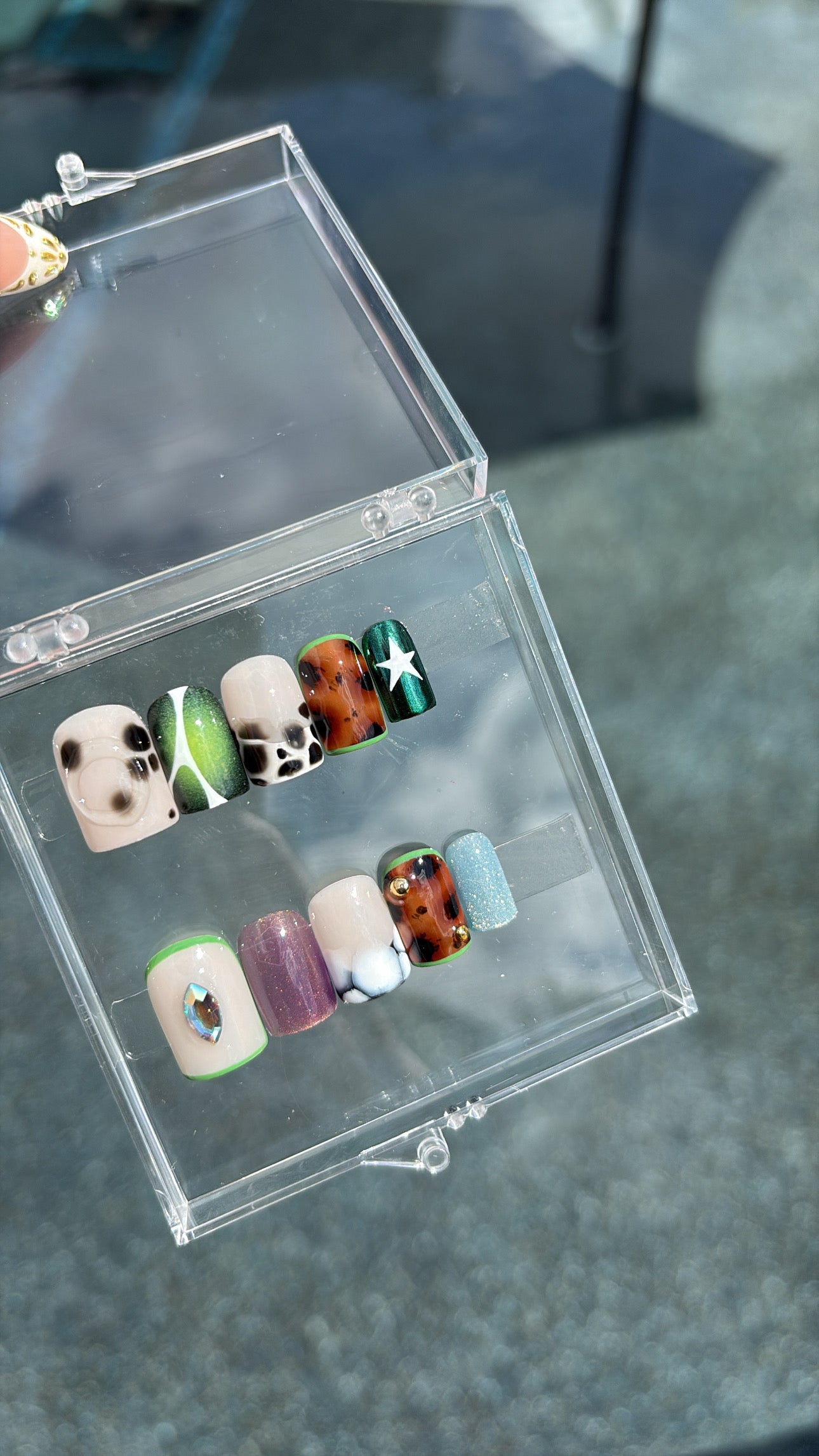 Each set comes with 10 handmade press on nails, and each order comes with a prep bag including Nail Glue, Sticky Tabs, Buffer, File, Cuticle Pusher and Alcohol Pad.